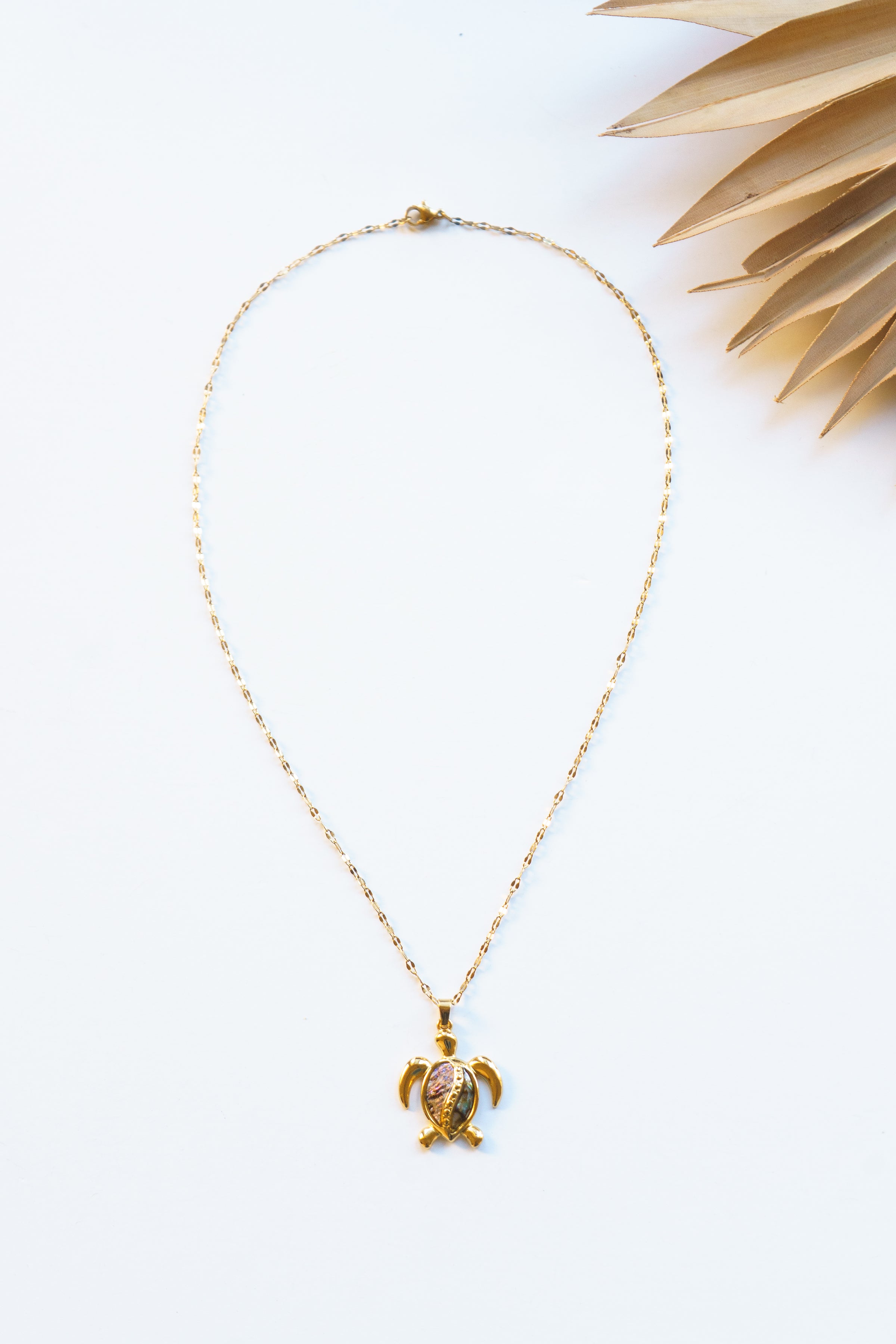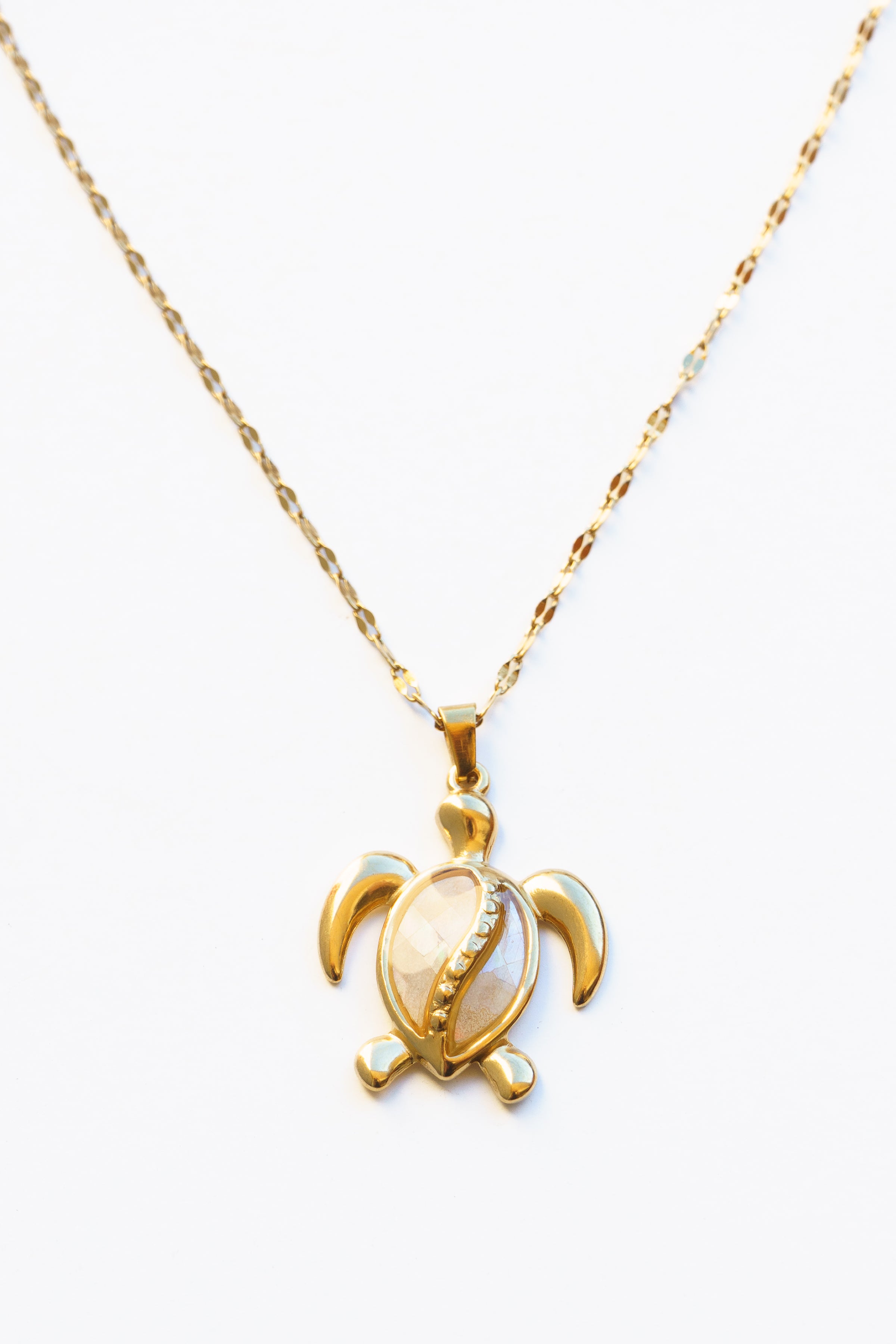 A sweet ocean-inspired turtle pendant with shimmering shell detail on a gold stainless steel chain. Lightweight and beach ready.