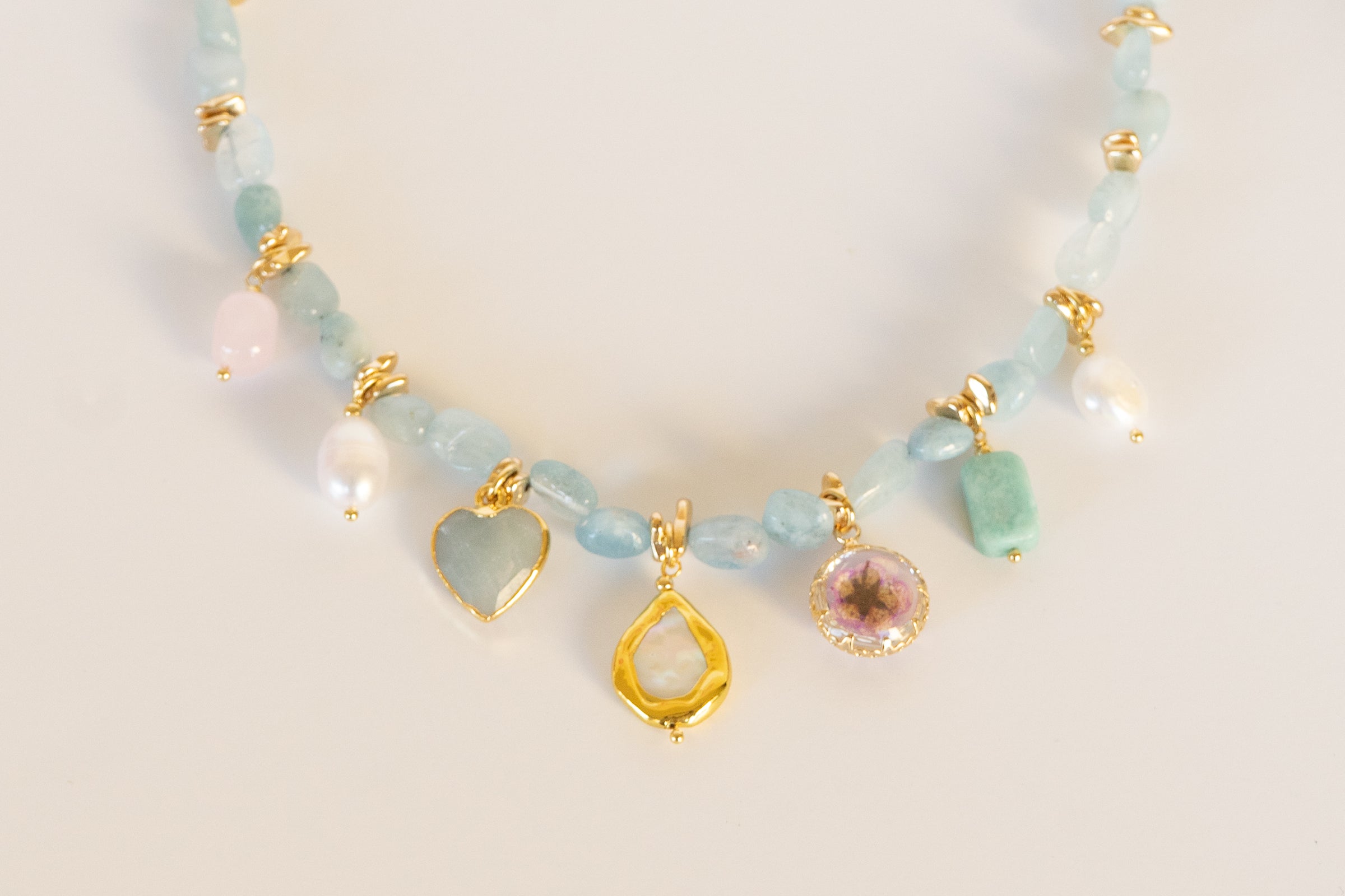 The Oceana Pearl Charm Necklace features smooth ocean-hued beads accented with delicate gold details and a curated mix of charms, including luminous pearls and playful coastal motifs.